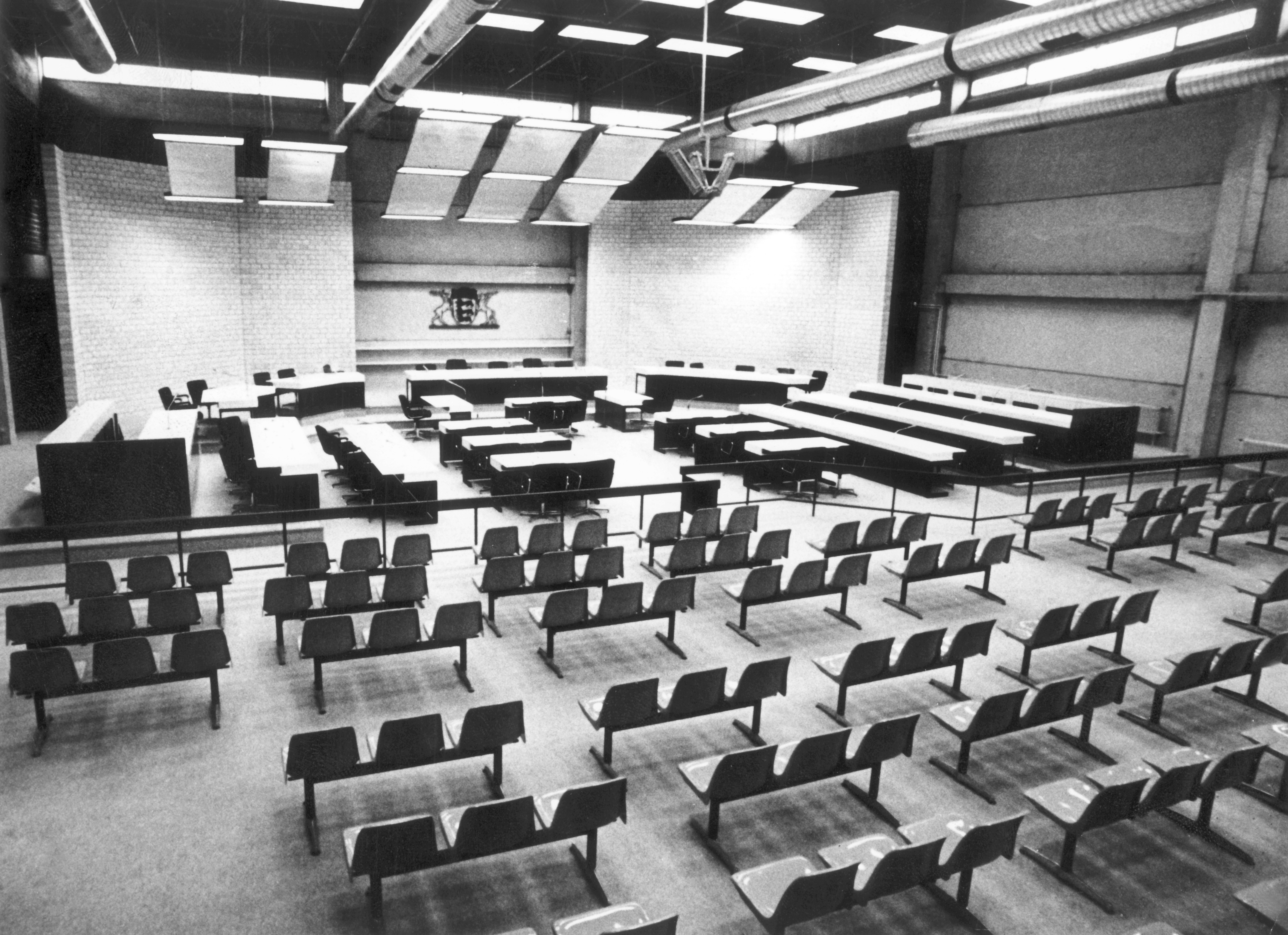 Am 21.05.1975 wird der Prozess gegen die Baader-Meinhof-Gruppe unter stärksten Sicherheitsvorkehrungen in der Justizvollzugsanstalt Stuttgart-Stammheim stattfinden. Das Bild zeigt einen Blick in den Gerichtssaal am 29.04.1975.